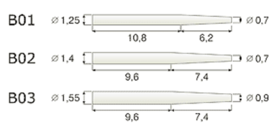 К преимуществам стекловолоконных штифтов IKS-В02-V относят высокую прочность, сопоставимую с титановыми образцами и упругость. Это упрощает установку и снижает избыточное давление на окружающий дентин.